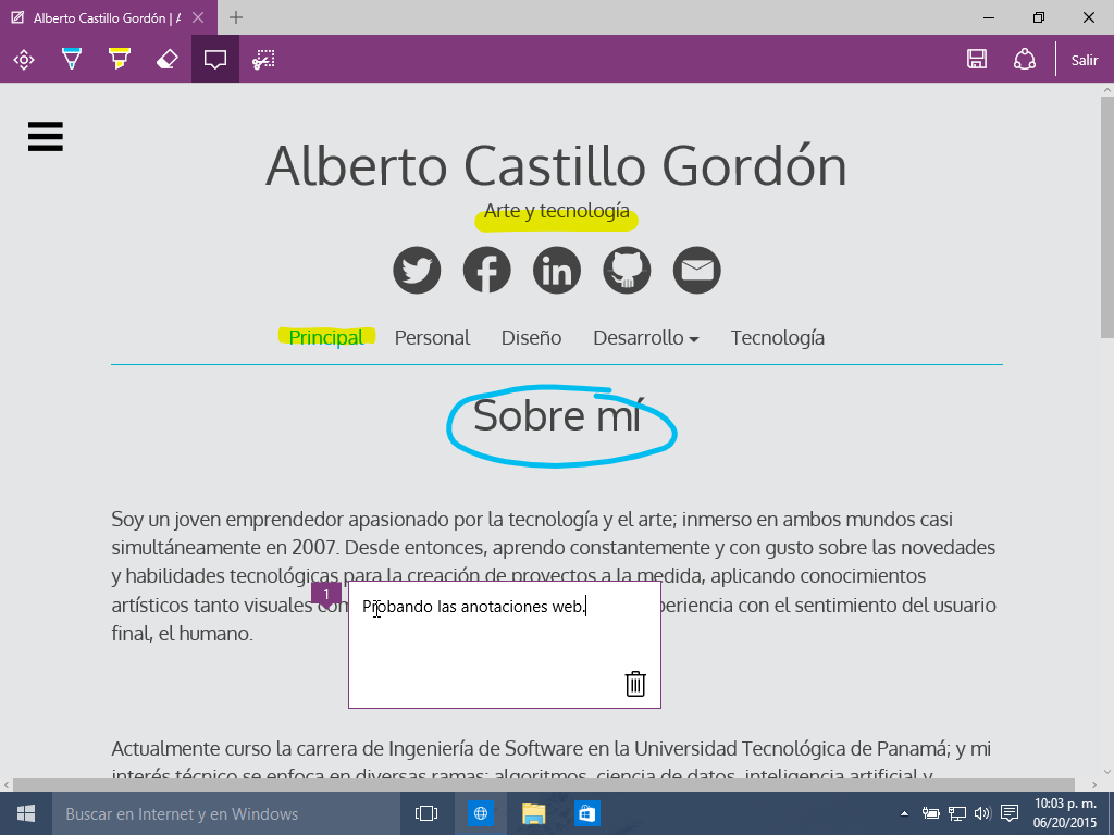 Anotaciones web: Si alguna vez has utilizado Evernote, debes tener idea de qué hablo. Project Spartan viene con una herramienta integrada que permite escribir notas sobre páginas web, rayar y resaltar, además podemos guardar dichas anotaciones; todo esto sin salir de nuestro navegador y sin necesidad de extensiones de terceros.